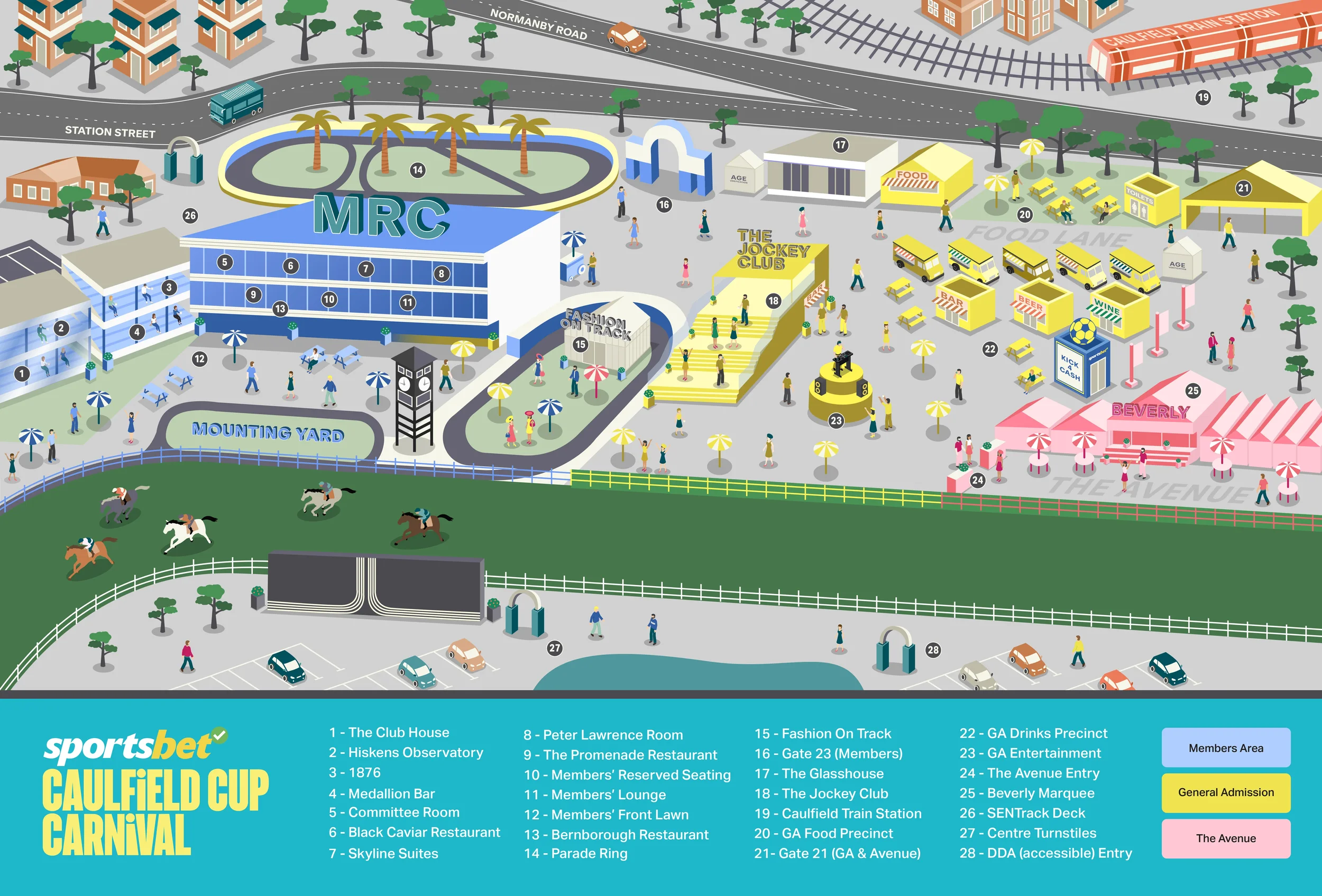 For Melbourne Racing Club I created a detailed map to help customers navigate around the impressive racecourse site.